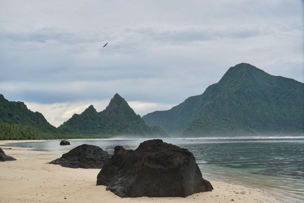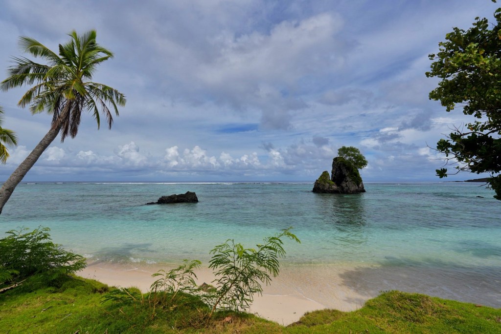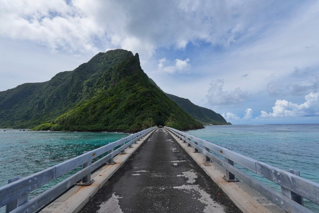 There were a few offshore islands visible alongside the road near the town of Ofu. Though the morning had mostly been overcast, it was just sunny enough to snap a few nice photos of the scenic locale before continuing back along the coast the other direction. We each stood watch for wild dogs, but none materialized.
