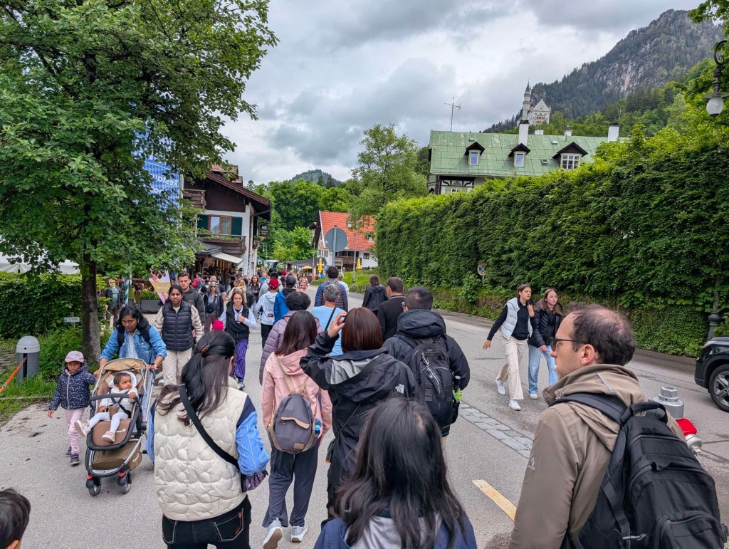 After grabbing some pastries at one of the few bakeries open on this day, we retrieved our rental car. Our first order of business was to check out Füssen’s most famous landmark – Neuschwanstein castle. Being well known, and recognizable, we found ourselves with thousands of other tourists. The closest parking lot was full, and we had to walk in from the second furthest relief parking lot.