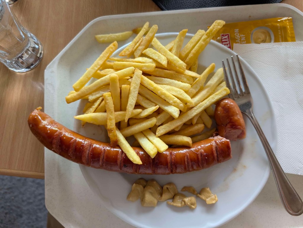 Anyway…we got back on the road toward Innsbruck and immediately hit traffic that added another 45 mins or so to our journey. This seems to be becoming a trend. Nevertheless, the Austrian border was not far, and we soon crossed into the birthplace of Wiener schnitzel, Red Bull, and 2025’s Eurovision Song Contest winner. We eventually stopped along the way at a rest stop where Nicole had a pretzel and I had a large würst. After another 30 minutes or so on the road, we were finally pulling up to Innsbruck.