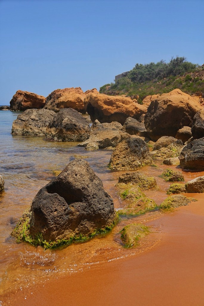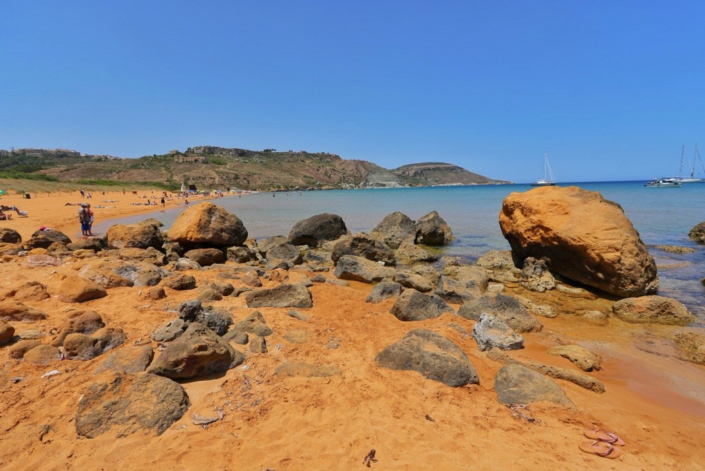 We eased into our day by driving up to Ramla Bay Beach, the only sandy beach on Gozo, and it was accordingly crowded. It wasn’t like Jersey Shore crowded, but we did have to park a ways away and walk in due to lack of parking spots. The sand is an orange-ish red color there. The skin color of the beachgoers was a similar hue of red or pure white — soon to become red. The water itself was quite cold, though many were not deterred by this.