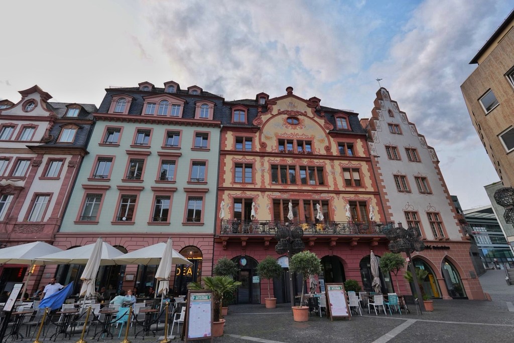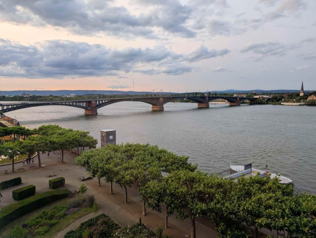 We boarded a bus, and ultimately took our special emergency exit seats in row 26. Shortly thereafter we were airborne. Two and a half hours later we were descending through turbulence into Frankfurt Am Main Flughafen. We parked at a hard stand, which meant we had to board another bus. What’s a girl have to do to get a jetbridge on this trip? Mercifully, the bus dropped us off directly at baggage claim and our bags were the first to come off the carousel. Perhaps the crew tags helped us. Rather than spend 50 Euro for an Uber or Bolt, we bought a couple of regional train tickets for 1/4 of that price. 20 minutes later we were arriving in Mainz and walked for about 15 minutes to the Hilton.