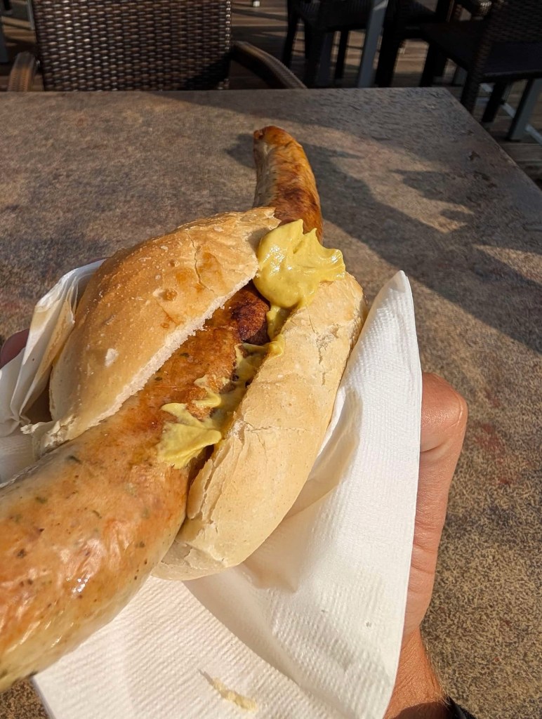 We were upgraded to a river view, and then moved to another river view room because there was a clear spot of dried tinkle on the toilet seat. Nicole may have been downgraded from Hilton Diamond to Gold status, but this golden stain on the toilet was taking it too far! Rain showers passed through the area, but as we ventured outside they had mostly stopped. Since my lunch was mostly desserts scavenged from the club, I was quite hungry. There was an unassuming couple of stalls on the Mainz Strand where we grabbed a bratwurst and a pretzel. For the first time in Germany, I feel like I finally got something that at least resembled the quality of German bratwursts you would expect to find anywhere in Wisconsin.