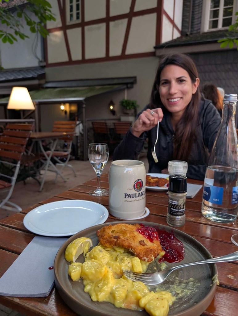 Since I already had a brat and Nicole had eaten a pretzel, we managed to split a plate with two schnitzels. I washed it down with an excellent Paulaner Dunkel. Very creamy and delicious. Though others were having the Hefeweizens and summery ales, it is most certainly dunkel weather. We were shivering despite it being June. Germany is always a wildcard with its weather. This didn’t stop the outside area from filling up to capacity shortly after I took the above picture.