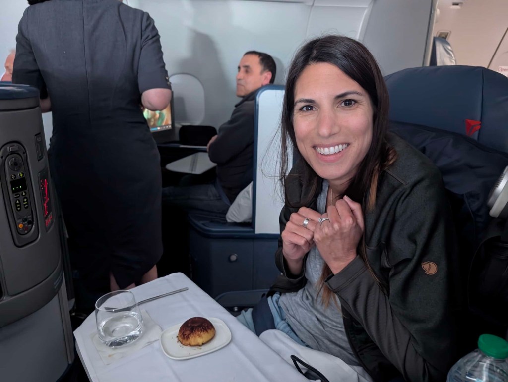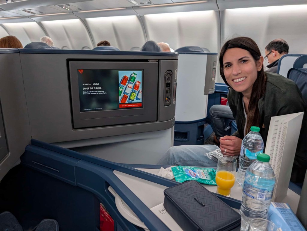 While we’ve done Munich and Frankfurt all the way back to L.A. in the past, it just seemed like a lot this time. I found a way we could break it up and get business, but we had to fly to Detroit. For some reason, Delta operates this flight. As Delta has no partnership with Frankfurt-based Lufthansa, it’s an odd flight route, and the flight loads reflected this. 17 open business class seats for the taking. After an okay breakfast at the Hilton, we took a Bolt to the airport and made a brief stop at a Priority Pass lounge where I grabbed a quick wurst and potato salad. They were pumping announcements into the club and we were summoned to go to the gate. Being a destination in the U.S., we had separate security at the gate. Shortly thereafter we were cleared into row 6. It’s an older Delta A330, so the Delta One suite isn’t quite as posh as some, but as they say — business is business.