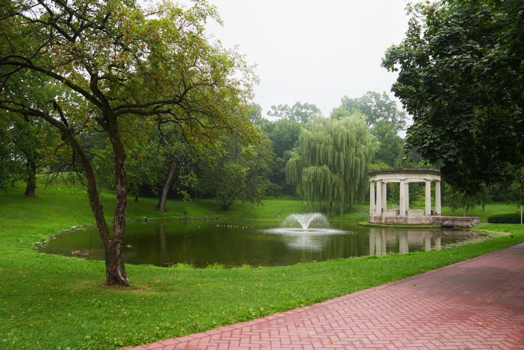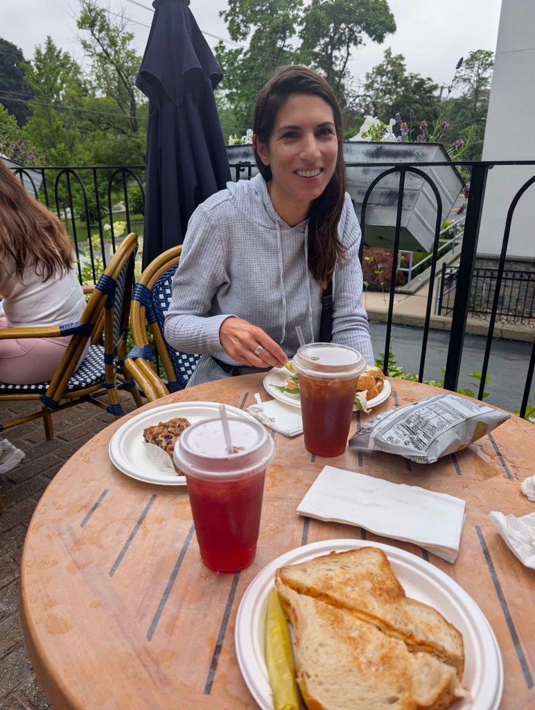 Saratoga Springs is known for its horse racing and there was evidently a race that day, perhaps one of the reasons for our higher-than typical hotel rates last night. There was also a Phish concert. So we have either horse people or potheads to blame for all this. I don’t think there’s too much overlap between those two subcultures. Anyway, we parked at Congress Park and walked through the town. It was quite lively. We each got lost in a bookstore for a spell before grabbing lunch at the Bread Basket Bakery, the only place in town where we could get a table.