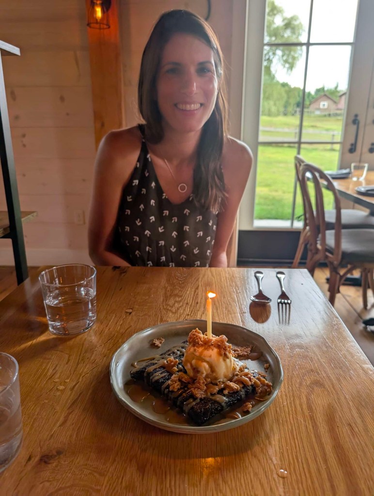 Naturally, the on-site restaurant is farm-to-table given that it is, in fact, on a farm. We split a salad and had pizzas. In the interest of accuracy, Nicole did not technically have a margherita pizza this time. It was pomodoro — really pushing the boundaries of her comfort zone. For dessert, we had a brownie sundae, which somehow they knew was for Nicole’s birthday. I guess it was entered as “occasion” during the online reservation, but I was still surprised that they even saw that and remembered when they brought it out. Good on them.