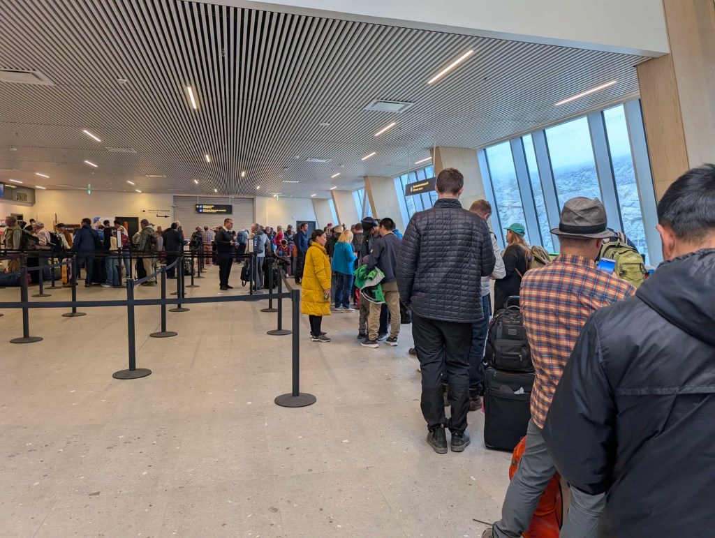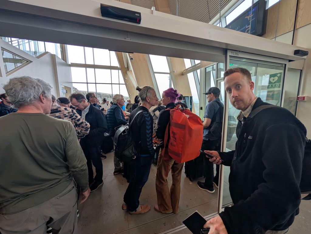 After battling hordes of people with nowhere to go, we joined line #3 to go through passport control. This led to holding tank #2, or a vague semblance of line #4. We were caught in a no-man’s land between customs and the boarding area since boarding had not actually commenced. Everyone just ended up on top of everyone else. Nicole found a chair at the side of the room and was told she couldn’t sit there. Her body groaned as it returned to its standing position. “Have you been doing a lot of hiking?,” asked the employee? “Nope, just standing for the last four hours,” replied the quick-thinking Donadio. Boarding was as chaotic and slow as the rest of the process, and we boarded our plane just before noon, departing more than three hours behind schedule. We had been at the airport for over five hours — a longer amount of time spent there than our adventures yesterday evening, and comparable to how much time we spent in our own hotel room. This therefore makes it our (and numerous others) top attraction in Greenland.