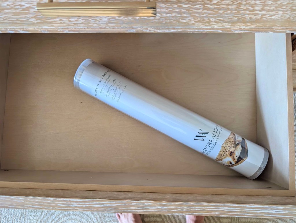 We took the tram back up to our room. I thought maybe the Waldorf staff would have atoned for their egregious sins of $38 s’mores and set it all up with a bottle of wine as part of the turndown service, but nooooo. Just a single tiny chocolate on one side of the bed even though they know very well there are two of us. We had to take matters into our own hands.