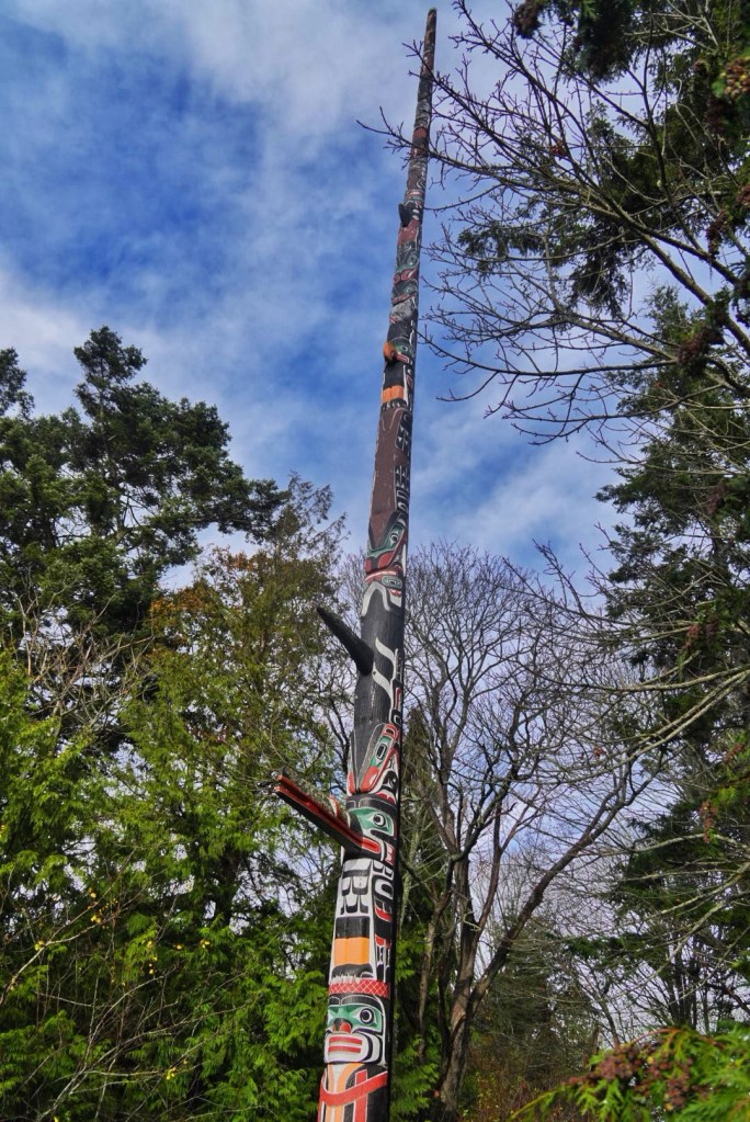 We drove back to downtown Victoria and the Abigail’s while the worst of the rain presented itself. The wipers were doing double duty. After regrouping at the inn, the rain seemed to have subsided (at least temporarily). We used this opportunity to head back out for a bit to nearby Beacon Hill Park. It contains one of the world’s tallest totem poles. There was a plaque labeling it as the tallest, but it is 5th tallest at best being outdone by others in British Columbia and even one in California. Nevertheless, at over 127 feet tall, it is by no means short.